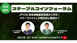 【「ステーブルコインフォーラム」開催案内】 JPYC社 資金移動業者登録から半年!ステーブルコインの現在地と展望は? 岡部典孝氏(JPYC)& 平野洋一郎(アステリア)が解説